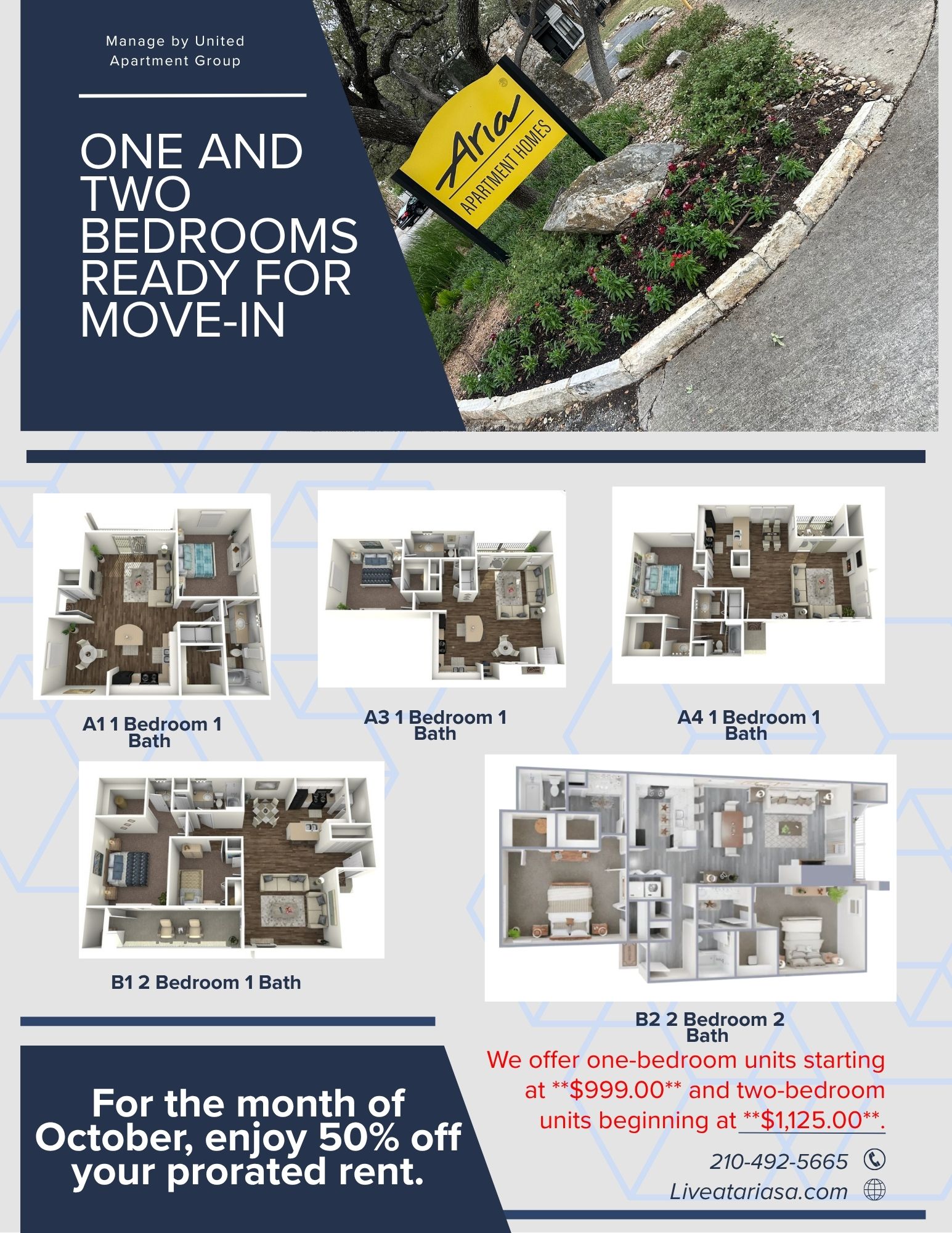 Lease through October and receive 50% off your prorated rent.